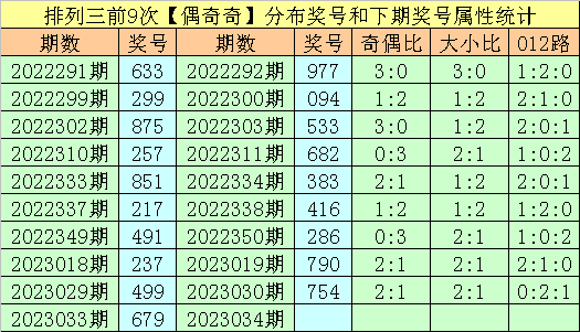 枚举三第2023033期奖号为679,直选奇偶散播为:偶奇奇,该奇偶散播历史上共出现了792次,前100期出现11次。