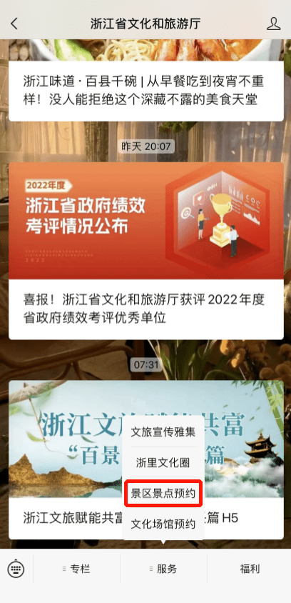 ①在微信搜索栏搜索 “浙江省文化和旅游厅”参加公众号;